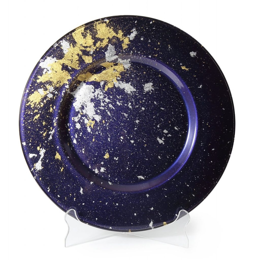 Syosaku’s Japanese Urushi Glass Charger Plate offers the perfect serving plate for a show stopping, front-and-center dish of the table. The majestic blue design with gold leaf detailing presents a piece of art to rest any culinary masterpiece. This plate is 100-percent dishwasher safe.