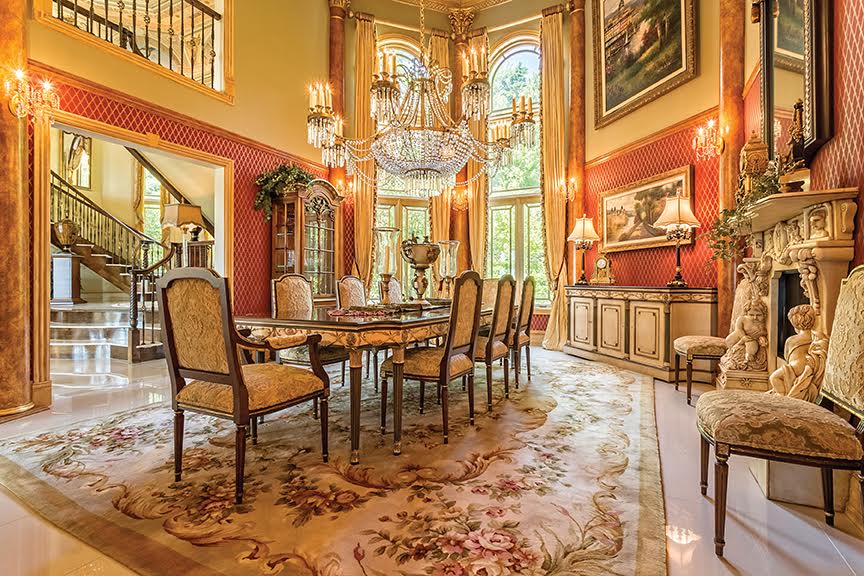 The rest of the main floor includes a massive kitchen, breakfast room, family room, and butler’s pantry. To the east of the foyer, and a parlor room and Mr. Carkhuff’s office is to the west. Throughout the main level and much of the home, intricate, gold leafed molding lines the rooms. The drapes, done by hand, rest atop the windows, without blocking the views. Much of the house is also decorated with larger than life chandeliers, hand looped and knotted rugs, ornate artwork, and rich colors, textures, and furniture.