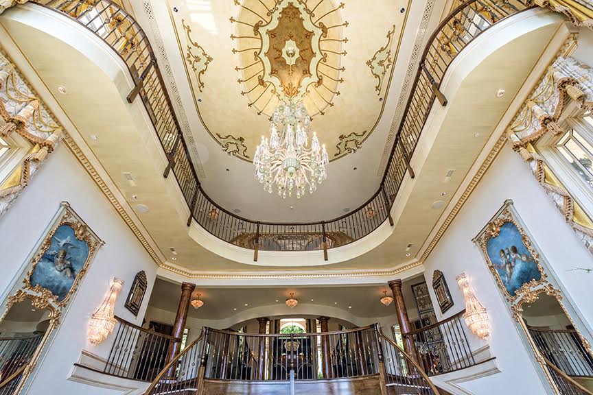 Driving through the gates and down the heated driveway, the home is remarkable. Inside, giant double doors and floor-to-ceiling windows span across every room. Walking into the grand entry foyer, one is instantly met with breathtaking views of the property, the Navesink, and beyond. Through the middle of the foyer is a giant marble double staircase, cascading marble floors, and above on the sky high ceilings, lies intricate artwork, like painted replicas of oriental rugs that Ginny liked. Mrs. Carkhuff explained that the artwork was done by Polish artists, who won the International Design Award in Poland for the work done on the home, and hand painted everything on their knees and backs for months.
