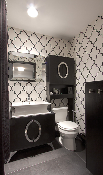 4. Use large pattern wallpaper for the bathroom; this adds depth and dimension to limited space. The picture above is from the home of a client who is a well-known DJ. To address his character preferences, I added handles to the cabinet that remind me of old vinyl records.