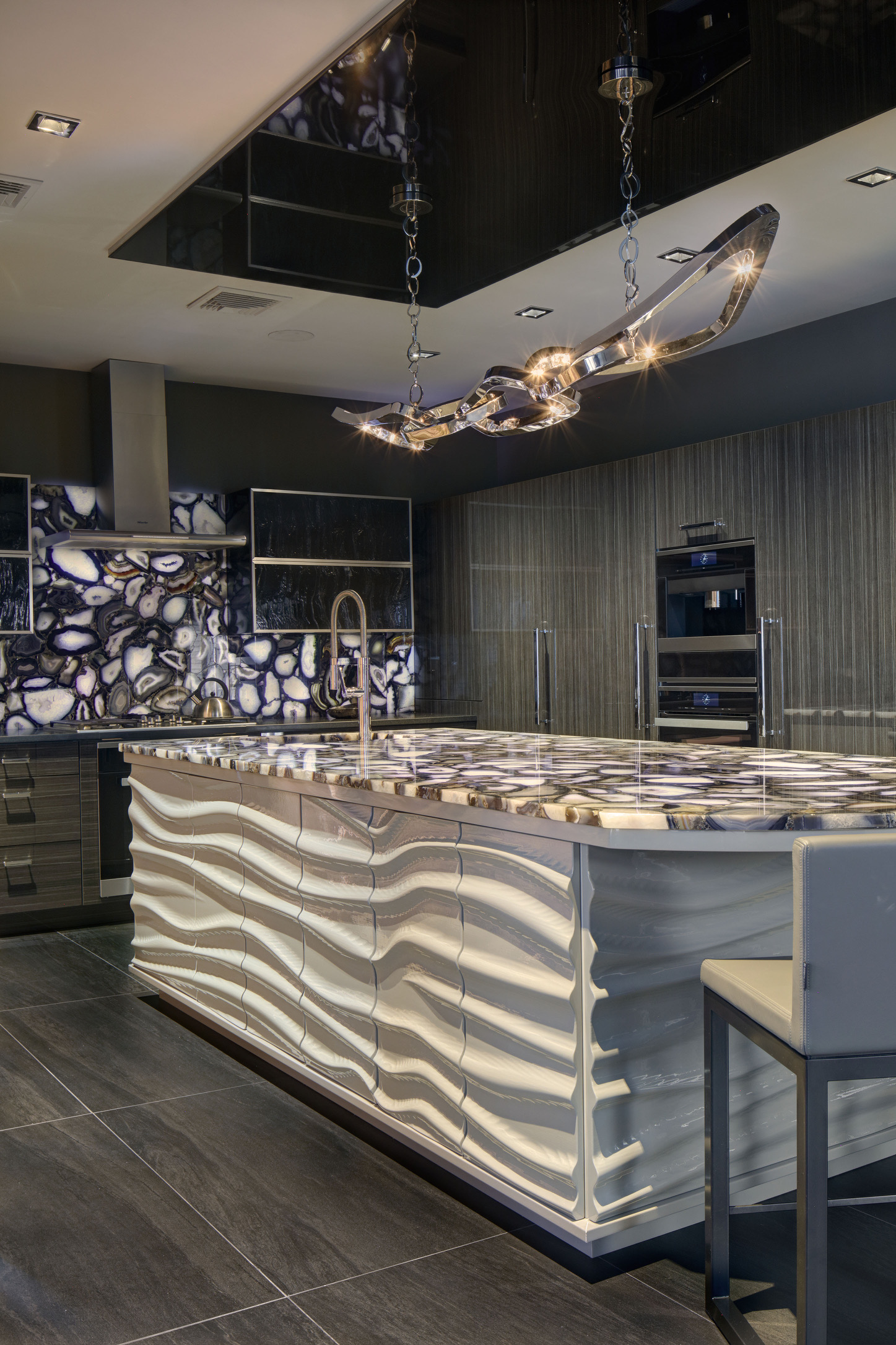 A barn door slides open to offer access to a sprawling pantry and double doors hide a small office complete with desk, file drawers, and shelving. With all clutter behind closed doors, the precious stone counter and backsplash made from agate become the showcase of the room. To further the drama the stone is backlit bouncing light that is reflected off the cracked black glass that covers a pair of cabinets flanking the cooktop and oven. “The owner knew she wanted to use the precious stone but was not sure which one. I brought her to a yard that had the slab she wanted. We knew that it would be the star of the space,” Mannarino said. While this home is the epitome of modern design, Mannarino said she doesn’t stick to a specific style. “It really is all for the client. Some want everything white, some want lots of color. I don’t want to be attached to one style. I’m happy to be appreciated for my past work, but I want whatever the spaces are to fully reflect who the client is and have that recognizable to everyone who sees it. That’s always my goal.