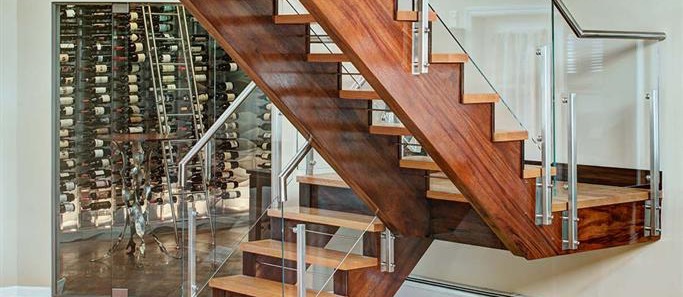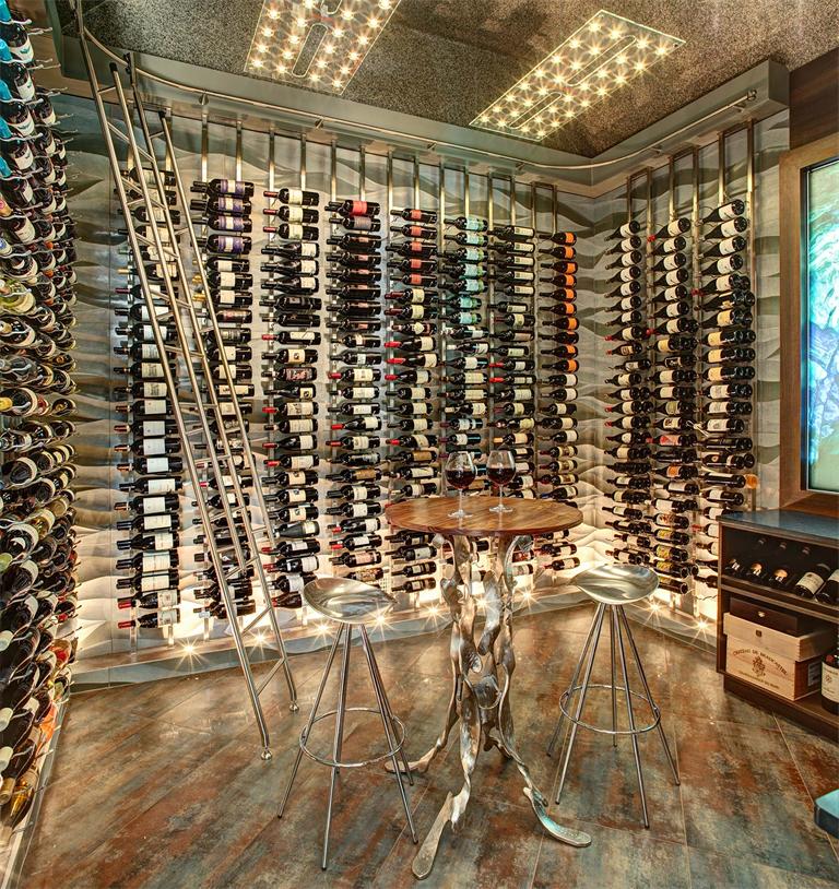 The owners were so thrilled with the results that they hired Mannarino to tackle more spaces, starting with a wine room that sat right off the living room. Originally the space had likely been an office or library, but the owners had started to transform it into a wine room. Mannarino took their idea for the fully refrigerated space a few steps further by adding space for wooden crates to add interest to the walls of wine. Three different types of tiles-carved tile behind the racks, porcelain flooring, and mosaics for the shelving–add visual appeal and keep it from looking too boxy. The tiles are tied together with copper and steel. Strategic lighting, including rom a lighted ledge that spans the wine storage, along with a panel that features an underwater scene, gives the feeling of being inside an underwater cave.