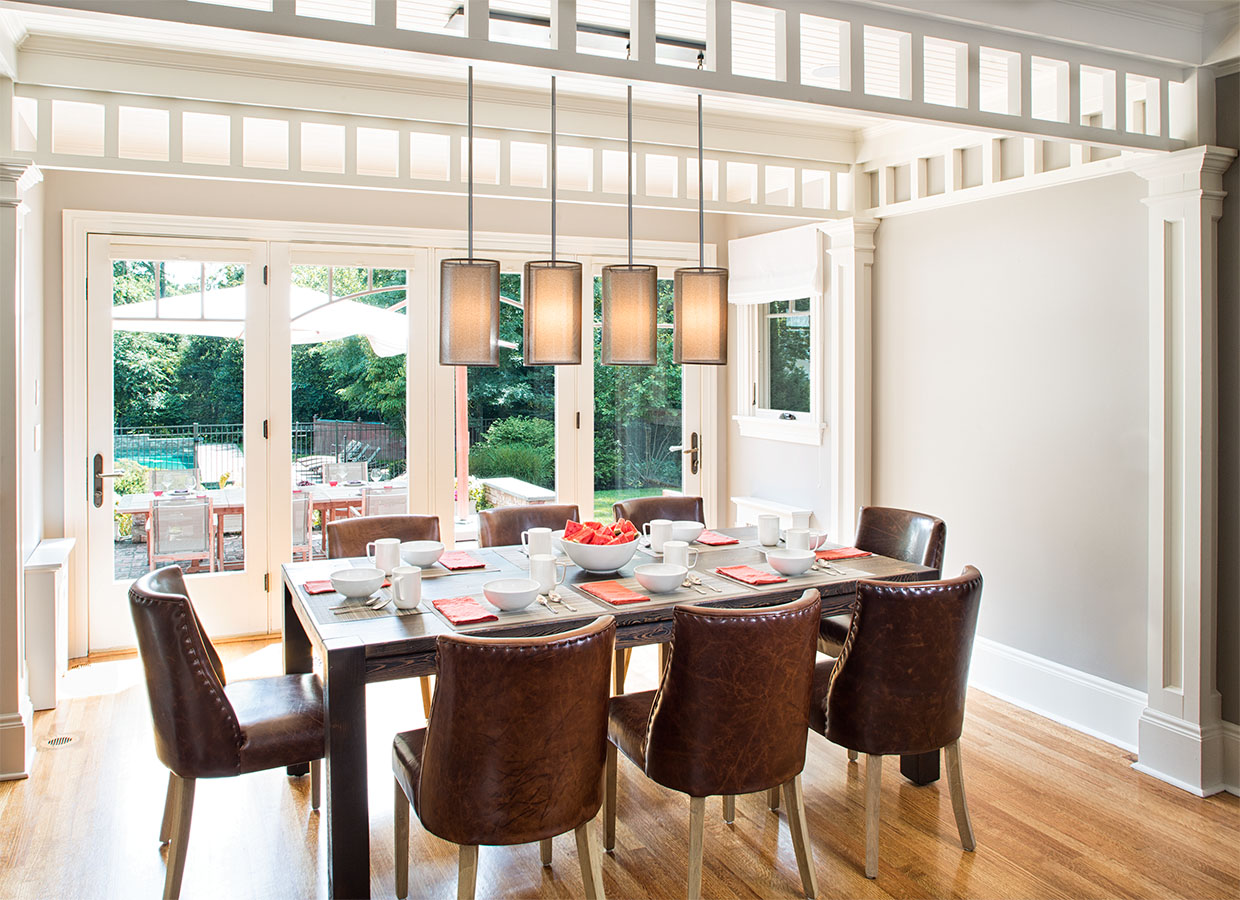 The house was originally a Tudor, which could be seen in some of the woodwork in the front entry and the ceiling of the living room. Watty brought the Tudor into today’s world by incorporating contemporary furniture, modern lighting, and the aforementioned soothing paint palette to transform it into a transitional style. Watty said the transitional style of the house gives it a “peaceful, Zen vibe”, which is only heightened by the deliberate fabrics of the furniture. For example, every curtain in the house is white sheer linen, and to Watty, this kind of repetition means “strength and balance. . . it just makes you feel good”. The living room rug also contributes to this feeling of well-being. It was custom-made to unify the space, which otherwise would have had less warmth. Adhering to her clients’ tailored and minimalistic lifestyle, Watty made every room look inviting with a combination of Bernhardt and Lexington furniture among others, some Visual Comfort lighting, and Palecek and Barlow Tyrie furniture for the outdoor decor. The neutral tones of the furniture mesh perfectly with the colors of the walls, which contributes to the home’s cohesion and brightness.