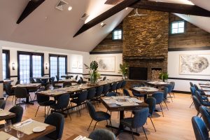 The barn-like building, once home to a restaurant called Harvest, transformed into a style Pollinger most notably refers to as “Nordic minimalism.” The simplistic design features a natural palette of neutral grey, off-white walls, and black accents throughout. Upon entry, the vintage barnwood and sleek walnut panels instantly catch your attention. For dinner, choose among the cozy tables in the lounge by the bar, the windowed dining room, or, on a clear night, the heated outdoor patio. The exposed, custom oak table tops encourage guests to find comfort in a casual environment.