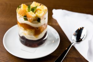 The entrée’s main protein featured a tender Cedar River Farms 12-ounce strip loin as the prized centerpiece of the fall menu special. The grade-A steak presented a seared golden crust on both sides and a juicy interior. The earthy tones from the roasted fingerling potatoes complimented the natural flavors of the beef while the swiss chard and red peppers lightened up the decadence. A roasted shallot red wine sauce, as rich as melted butter, seamlessly married the whole plate together, bringing this seasonally inspired dish to an unquestionable victory for the night.