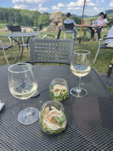We walked through the fields of grapes up to a plateau overlooking the vineyard and river valley for the special event that day. The peaceful hilltop was set up beautifully with tables and umbrellas to admire the views as well as listen to an outstanding guitarist. Four stations consisted of a glass of wine with a food pairing. We started with Grand Reserve Dry Riesling paired with a small arugula salad. Next was a Grand Reserve Chardonnay paired with a crab cake slider. The third station had a Grand Reserve Pinot Noir paired with a crostini. Then last was Cabernet Franc with meatballs.