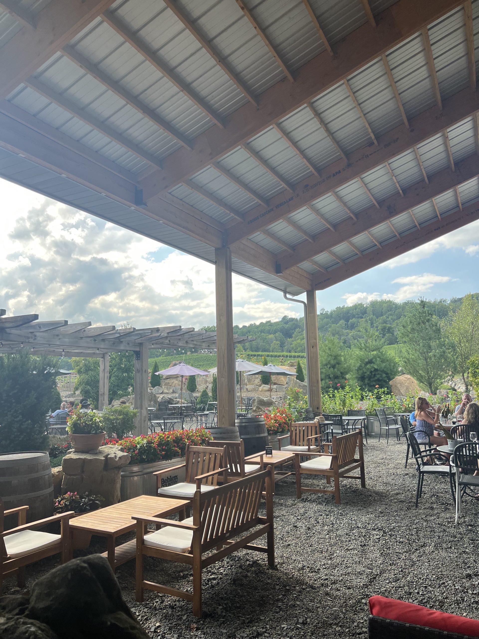 When you enter, you walk through the tasting room, which also serves as a showroom for their selection of wines, to a beautiful pavilion surrounded by acres of valleys. There was plenty of seating where people could enjoy a live band and freshly made wood-fired pizzas, charcuterie, and wine flights.