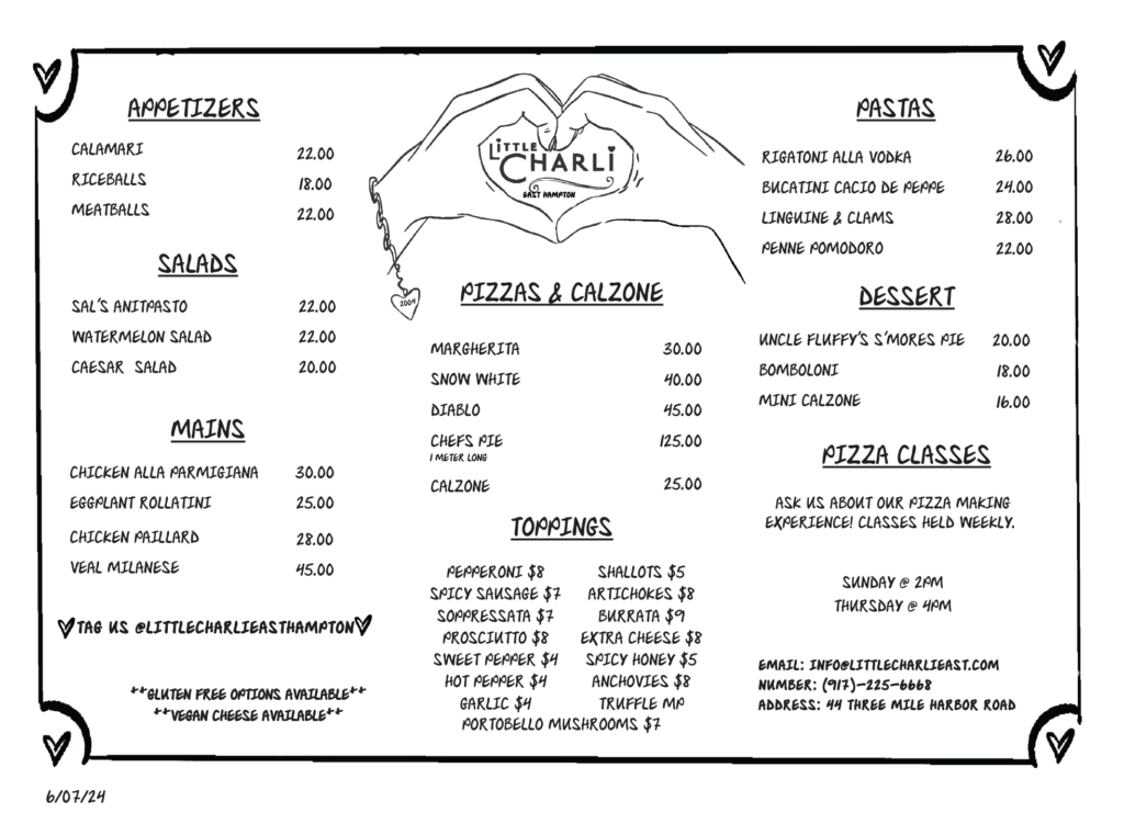 Italian pizzeria Little Charli opened on Memorial Day weekend this year at 44 Three Mile Harbor Road, the former home to a Turkish Eatery called El Turco. Founded by Chris Reda of the Drink & Enjoy Crew, the rustic and welcoming restaurant embraces late-night hours, has a full menu, and even hosts pizza-making classes. Their special oven is wood-burning using cherry and oak wood, and their Roman-style pizza has a 34-hour fermentation process. If you’re with a crowd, get the Chef’s Pie, a one-meter-long pizza with prosciutto, burrata, arugula, shallots, and fresh truffle shavings. Some other popular pizza pies are the Margarita, Snow White, and spicy Diablo with Soppressata and honey. They even have a list of 13 different toppings on the menu that diners are welcome to add to any pie. While there is another Little Charli in the West Village, Manhattan, there are appetizers, a salad, pasta, and desserts that are exclusive to East Hampton.