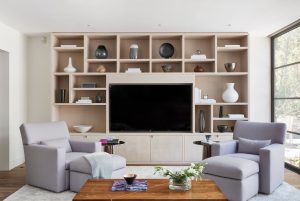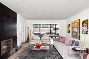 While it is difficult to be completely sustainable, natural materials were used whenever possible, including for rugs and cushion fills, natural vibrant dyes for fabrics, and wool for their building insulation. The renovations continued from there, made to support clients who were transitioning to empty nesters. The house’s original architecture featured a central colonial style hall with a dining room on the right, a living room on the left, and the kitchen towards the back. Grochowski reimagined this structure: the back of the house was removed and she designed an addition with a more open floor plan–creating flow within the spaces and abundant access to views outside. The house now evokes the feeling of freedom and lightness, allowing the homeowners to be together, or “live collaboratively,” even while working separately.