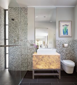 Another aspect of this home that contributes to a holistic lifestyle is Grochowski’s complex use of color. The rooms range from having clean backgrounds with the only hint of color coming from accessories to possessing a vibrant purple rug or artwork flecked with every color of the rainbow. Grochowski describes this juxtaposition by saying “when you’re trying to create a sense of calm with color, it’s not overdoing the color—it’s the balance between the neutral and the use of the color.” She also recognizes the comfort in familiarity; much like how RHG A+D used metal as a common material from room to room, the color purple can be seen in nearly every room of the house, inspired by the outstanding rug in the foyer. The downstairs theater has a light purple sofa, the master bathroom chair has a rich hue to it, and even the flower bouquets, despite the variety in their backgrounds, show the shade’s versatility. However, Grochowski ensures the color is not overdone; she says that by threading a specific color throughout a house, “it’s having the color with some restraint, and then also finding the places that you want to have fun.” One of the prominent elements that supports Grochowski’s vision is the steel and smart glass wall at the back of the house. It floods the indoor living space with natural light and views of the lush backyard, which is multi-colored all seasons of the year. Here, the ideal connection between indoors and out is exemplified. To Grochowski, “engaging with outdoor space is an inherent reminder of universal connection and that supports peace and wellness.”