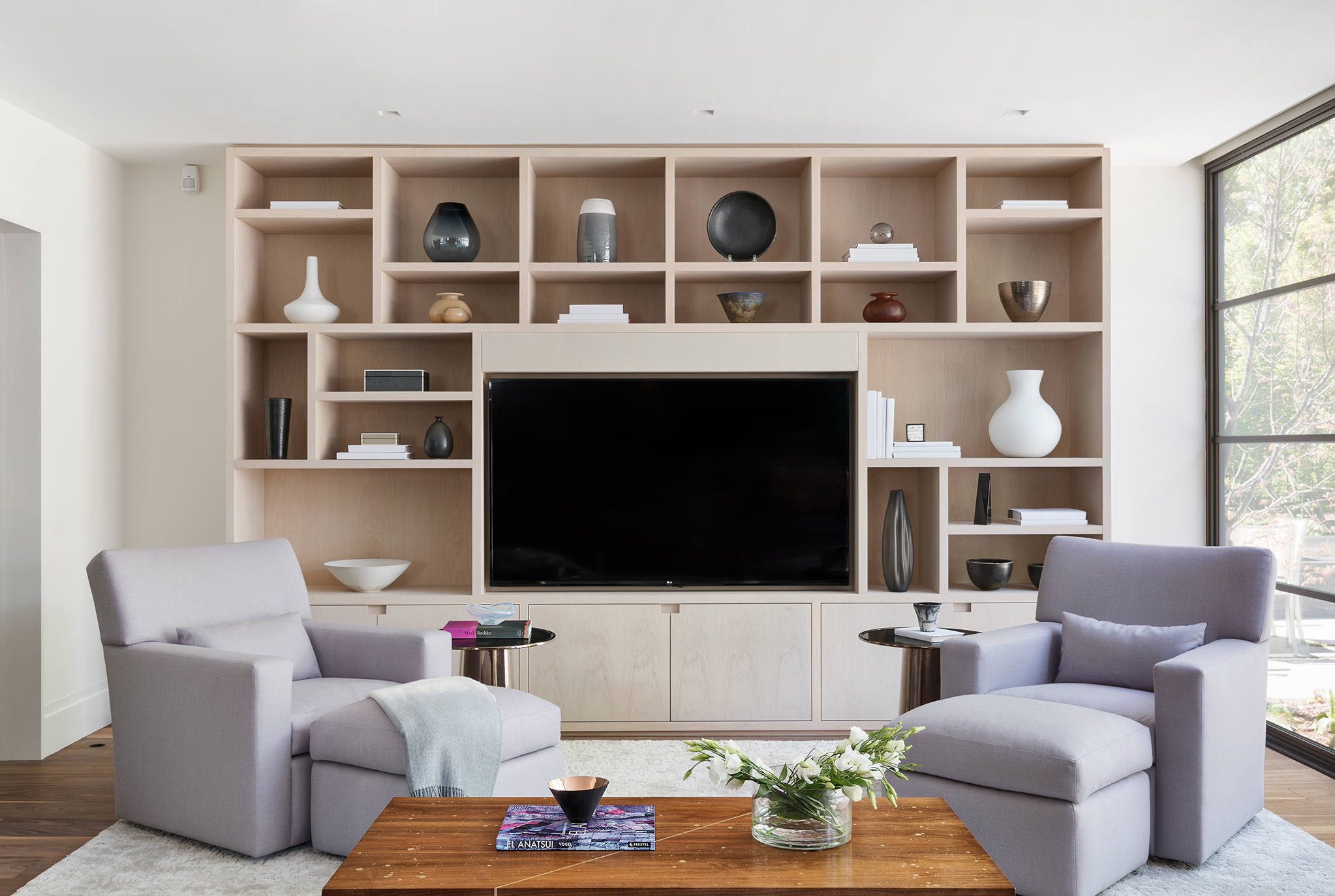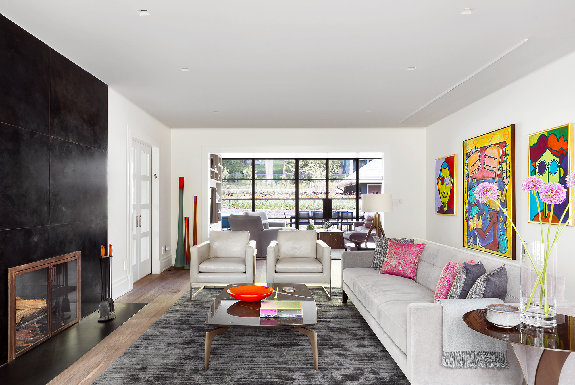 Another aspect of this home that contributes to a holistic lifestyle is Grochowski’s complex use of color. The rooms range from having clean backgrounds with the only hint of color coming from accessories to possessing a vibrant purple rug or artwork flecked with every color of the rainbow. Grochowski describes this juxtaposition by saying “when you’re trying to create a sense of calm with color, it’s not overdoing the color—it’s the balance between the neutral and the use of the color.” She also recognizes the comfort in familiarity; much like how RHG A+D used metal as a common material from room to room, the color purple can be seen in nearly every room of the house, inspired by the outstanding rug in the foyer. The downstairs theater has a light purple sofa, the master bathroom chair has a rich hue to it, and even the flower bouquets, despite the variety in their backgrounds, show the shade’s versatility. However, Grochowski ensures the color is not overdone; she says that by threading a specific color throughout a house, “it’s having the color with some restraint, and then also finding the places that you want to have fun.” One of the prominent elements that supports Grochowski’s vision is the steel and smart glass wall at the back of the house. It floods the indoor living space with natural light and views of the lush backyard, which is multi-colored all seasons of the year. Here, the ideal connection between indoors and out is exemplified. To Grochowski, “engaging with outdoor space is an inherent reminder of universal connection and that supports peace and wellness.”