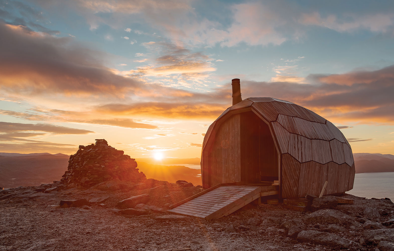 Most hikers are elated to reach the summit of a mountain and experience its breathtaking views. In an effort to boost tourism and keep wilderness junkies in mind, SPINN Architects designed cabins that are placed at the very top of the fjords of Hammerfest, Norway. Much like a three-dimensional puzzle, Dagsturhytter was assembled using 77 wooden panels that were meant to replicate the stones and boulders of their surroundings. Their angled shape naturally prevents snow or rain from puddling on top, therefore preventing weather damage. Through the use of 3D laser scanning technology, the designers were able to shape the windows and doors with wind direction, views and accessibility in mind. The two rounded cabins are used to welcome explorers and offer a space for them to eat their packed lunches and comfortably experience the beauty of their surroundings while being protected from the weather. From its panoramic vantage point, Dagsturhytter reigns over the fjords with a humble, yet sophisticated presence.