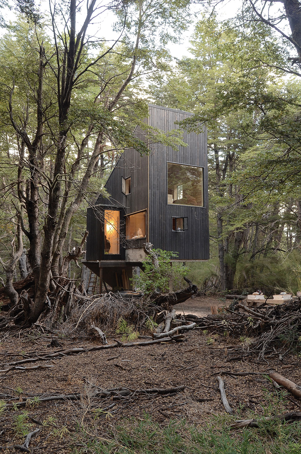 This Chilean getaway is the first cabin designed and built by Del Rio Arquitectos Asociados (DRAA) and Magdalena Besomi. The cabin and its upcoming counterparts are part of a project meant to populate Chile’s native woodlands. The home has a diagonally-shaped roof that points toward the sky much like trees do as they reach for sunlight. Shangri-la sits on a thin concrete platform, minimizing its impact on the ground. Its angles change depending on one’s point of view for both visual interest and to complement the angular shape of the cabin itself. The interior is lined with timber planks that were reused from fallen trees, while the outside is covered with charred pine. Shangri-la’s interior layout was designed in layers as to evoke a “nook” feeling for each individual space (bathroom, bedroom, kitchenette, and sitting room). The sitting room features a large window that offers panoramic views of the woods.