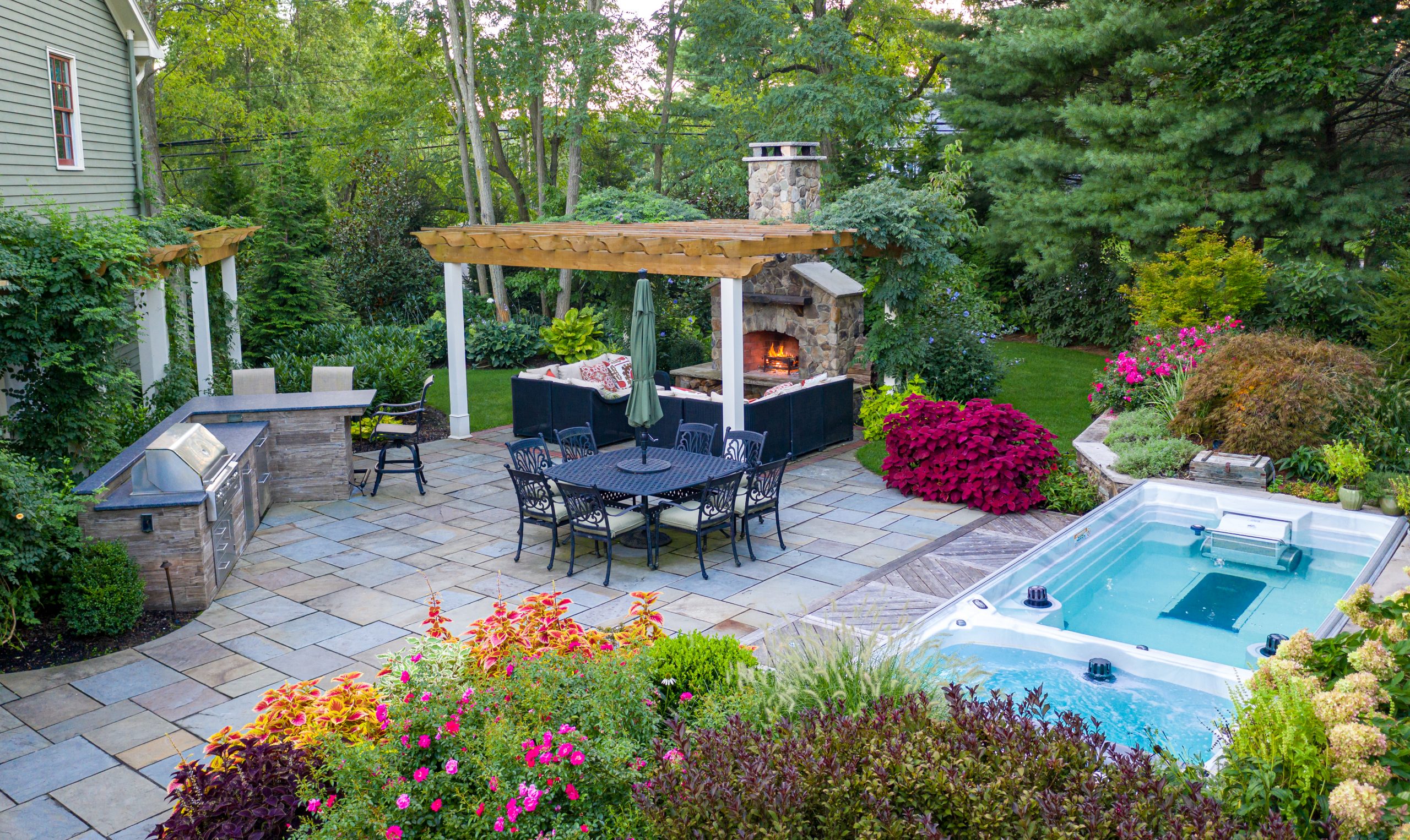 In the weeds or actually out of the ivy, CLC’s primary service is for pools. “The biggest difference between a pool company and us is that we integrate the pool into the entire backyard,” said Cording. Thus, CLC takes into account the sun angles and the privacy purview while endeavoring for aquatic imagery that looks good year-round. “So when you’re sitting on that patio, looking across the pool, there’s a beautiful water feature on the other side,” he said. You also want to position the pool so you’re not looking at an out of place pool cover for eight months, Cording added. However, CLC’s main job is design, not installation. But the firm is still on top of the process no matter the installation. “My son has built up a tremendous repertoire of subcontractors,” said Cording, and CLC oversees the entire project from concept to completion. So the roster stands ready to deliver an indoor amenity that virtually every design seeks. “Customers want an outdoor kitchen or a fire element,” said Cording. Of course, customers typically want cover. “Right now, so many designs include a pergola with a fireplace and an outdoor kitchen,” Cording revealed. But bringing the indoor-outside for the family meal or a larger together works best when the eyes are served as well as the stomach. Unfortunately, that’s where other companies can fail. They chaotically rush to fill empty space with plant life and flowers. “Planting is an art form that has been lost,” said Cording. A huge focal point of CLC’s operations, Rich, Jr. lays out the specs artistically and prepares a canvas that invites all year round. “The biggest compliment I hear about Rich is, ‘I never thought it was going to look this beautiful in July and September,” beamed Cording. Rich, Jr’s Master’s degree also makes sure the greenery is appropriate to the environment, so ‘adaptive’ planting thrives along with the natural order.