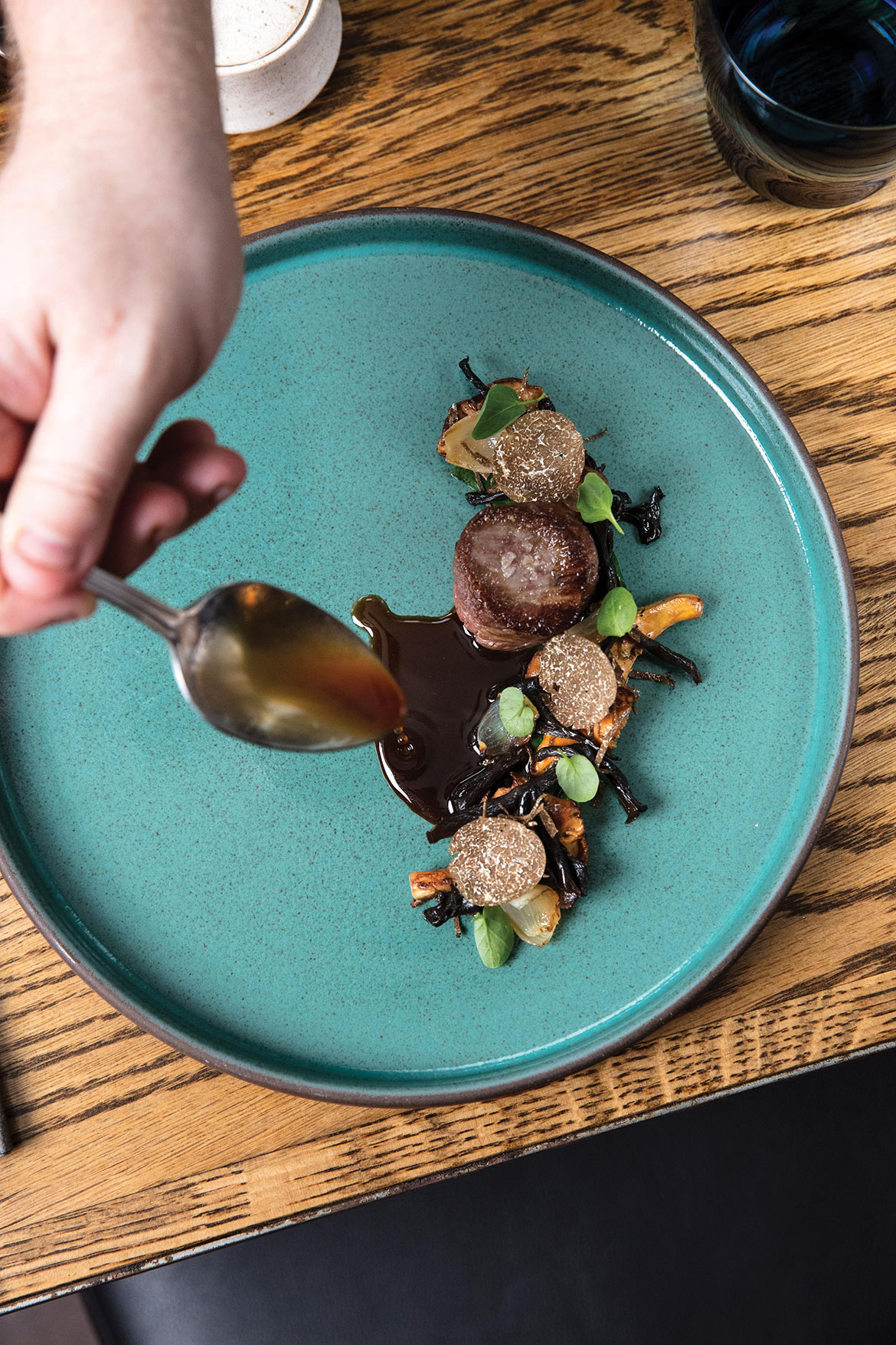 The interior, not unlike the restaurant’s food philosophy, is far from stuffy. The two-story space contains referential nods to minimalist design with rustic and industrial finishes, lots of natural light, a larger than usual communal table and earthy dinnerware by local artisan Jono Pandolfi. Upstairs, guests will find the “Chef’s Library,” a private dining room adorned with the Ryan’s personal collection of cookbooks lining the walls. The first floor, although, is where you’ll want to sit for unparalleled views of the open kitchen and if you’re lucky, you can snag a spot at the countertop—though usually booked out at least 60 days in advance.