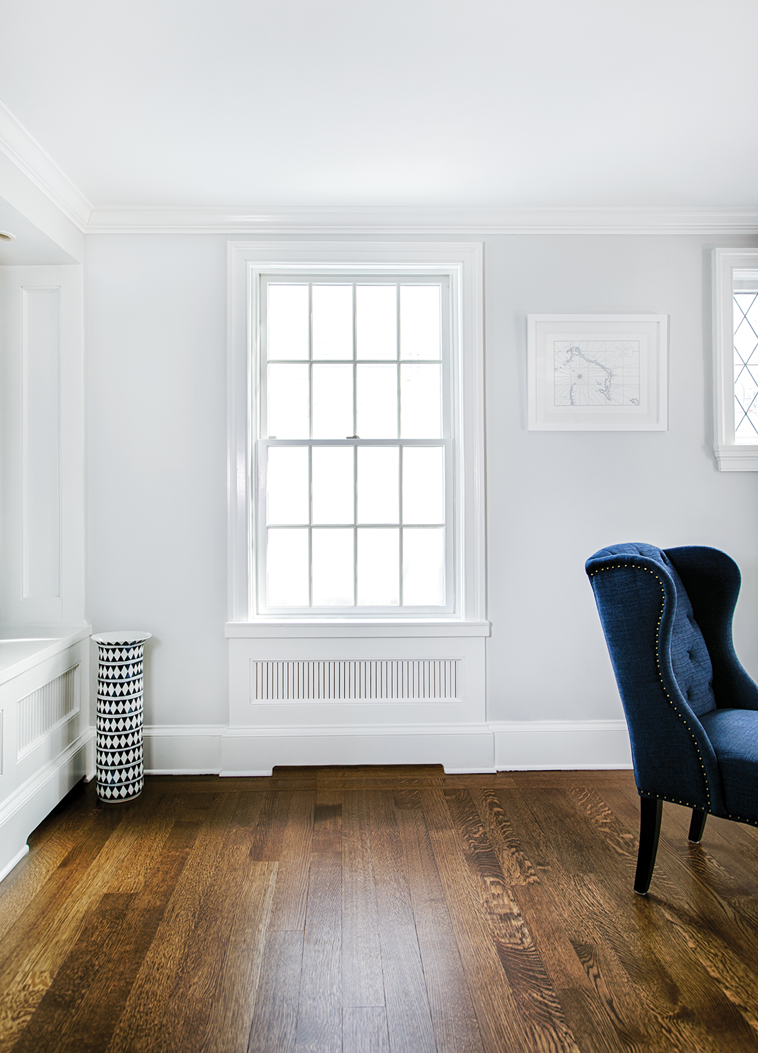 The renovation process began with flooring and trim work. Dated flooring with oversized tiles was quickly replaced with “new rift and quarter sawn white oak floors in a satin finish,” Mannino told me. When the floor was finished, the team moved on to the trim, which was previously undersized—a style unfit for a contemporary project. The moldings were replaced with thicker, more substantial sized baseboards and crown molding, instantly updating the rooms. Mannino’s team also used trim work to help disguise built-in wall radiator heaters, allowing them to function behind the scenes.