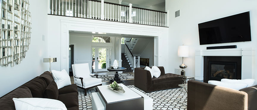 Shades of brown and white dominate the space, but standout pieces like an area rug from Tibetano in Englewood and accent tables from Global Views in NYC help to bring balance to both tones. And after restoring the floor-to-ceiling windows to their former glory, the space catches stunning natural light spanning the entire room up to the second floor balcony. Schwarz also used artistic accents such as the room’s mirror, a piece made of fragmented glass and metal, one of many rare finds for this home. Typically with artwork Schwarz suggests a few options for her clients, but after finding this piece, there was no doubt it was a fit for the room.