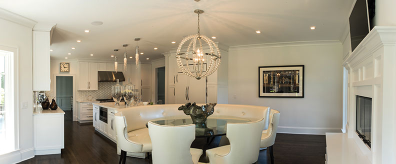 Newly stained hardwood stretches throughout the home, and it’s most prevalent in the kitchen. But what makes many of the rooms Schwarz designs standout are the lighting fixtures she chooses for her clients. Shimmering pendant lights over the island are a radiant sight, these also relate to the sphere-like chandelier over the kitchen table, a piece comprised of crystals and bright metal. These fixtures, and all of the lighting throughout the home, were hand-selected at West Essex Lighting Studio in West Caldwell.