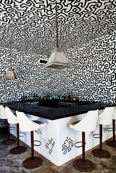 The property offers usual hotel-like amenities, but in a way that speaks to its unique personality. The steam room, for example, has a James Turrell-inspired installation which lights up with alternating colors. Did we also mention that it’s located underground? The Keith Haring-themed bar area, while totally Instagrammable, was also exclusively designed for Casa Malca, and features a custom black and white patterned wallpaper head-to-toe.
