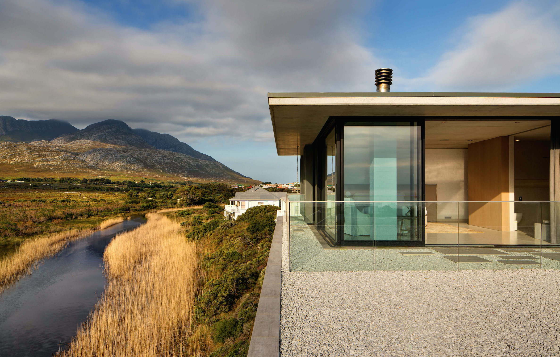 Restio River House sits on the mouth of Pringle Bay, a small coastal town less than an hour from the buzzing port city capital of South Africa where cable cars climb to the flat mountain tops and boats cruise through the busy harbor.