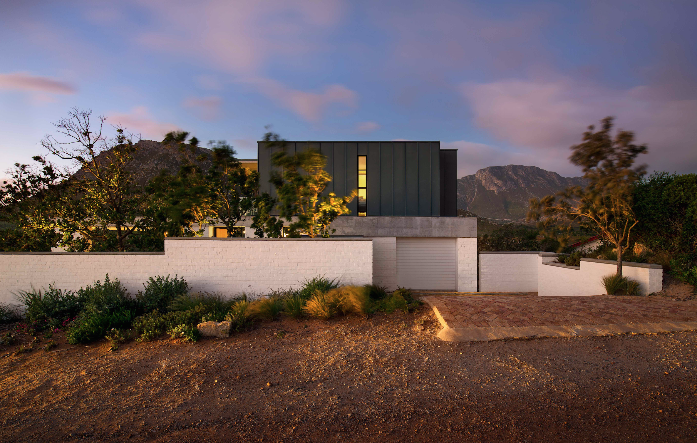 The Buffels River flows alongside the Restio River home which sits at a high elevation with lots of access to the surrounding fynbos (small belts of natural shrubland and heathland vegetation). The natural landscape around the house and the internal courtyard incorporates as much South African natural beauty as possible with the encompassing indigenous vegetation. South African trees including Milkwoods, Coral trees and Waterberry’s were also planted around the exterior of the home to wrap in a South African feel.