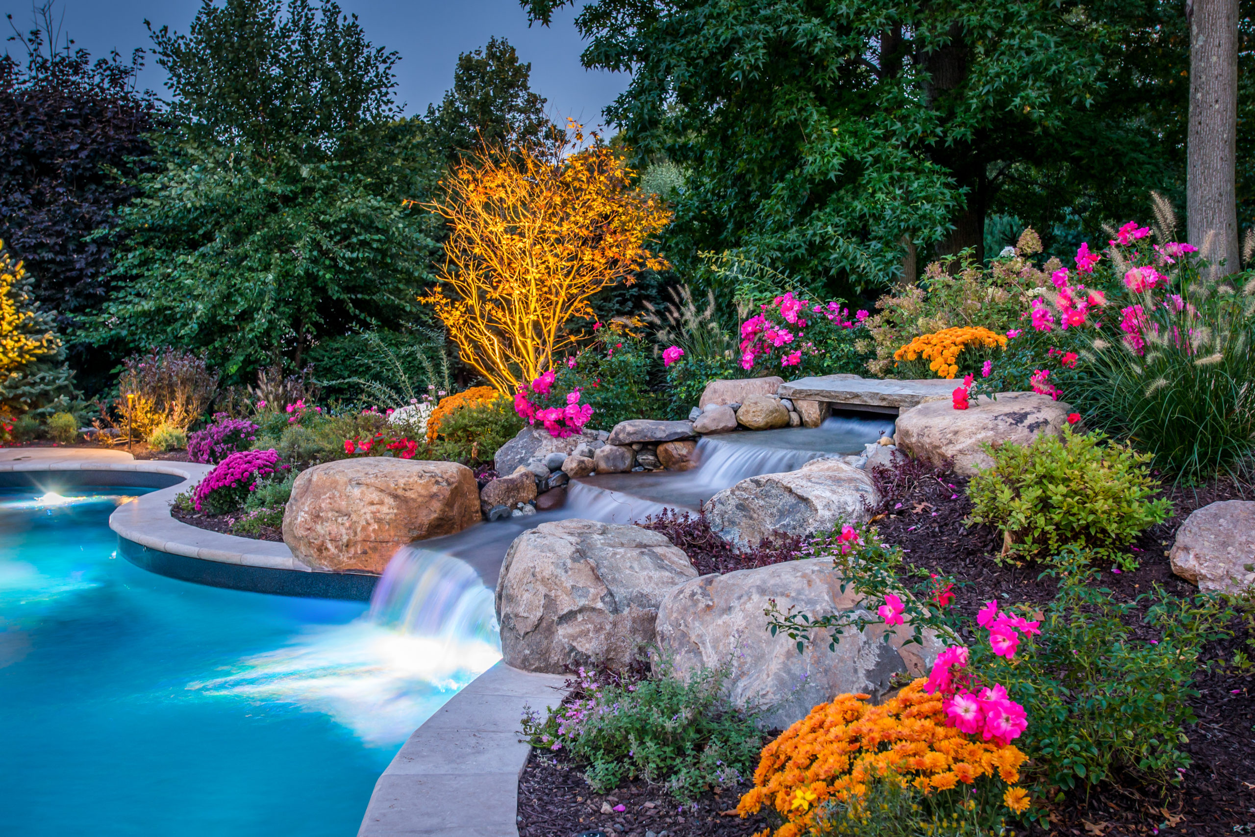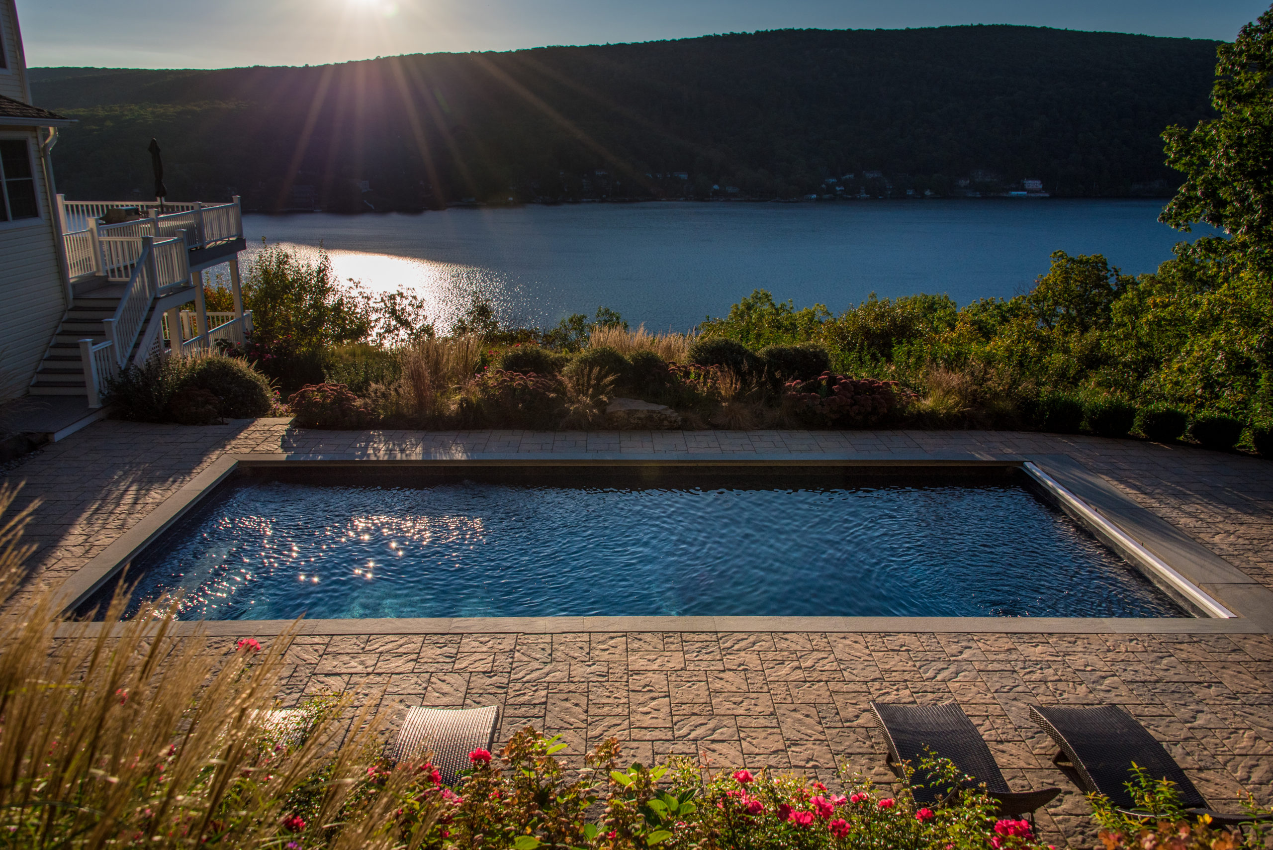 Rich Jr. and Chris both recall one of their most unique and fun to do projects that was on a steep mountainside slope overlooking Greenwood Lake. The slope was daunting, but a creative design that integrated the pool into the site conditions, along with extensive logistical planning between the production teams of CLC and The Pool Boss, turned the project into a majestic banner for both companies. “I will never forget how Chris and I worked side-by-side directing the giant excavator to carve here, fill there, and place boulders just right. At one point we uncovered ledge rock that Chris and I decided to integrate into the area above the pool patio and into the finished landscape,” Rich Jr. says. The ledge rock became a focal point that the homeowners now love showing off to their guests.