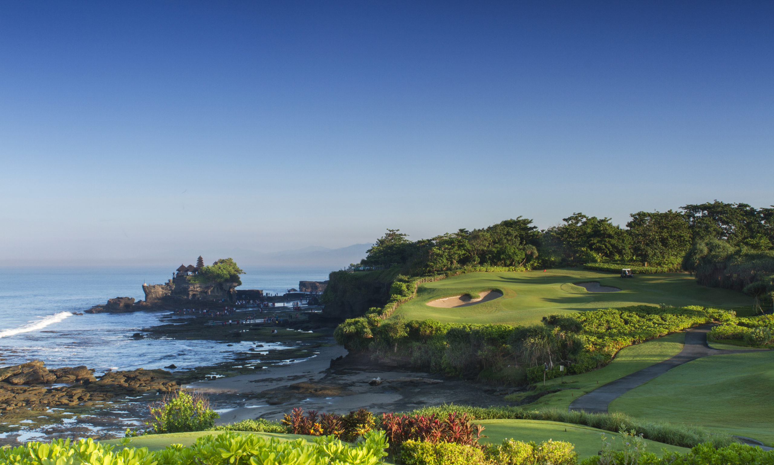 At the southeast end of the Bukit Peninsula, resorts pepper the coconut groves and beckon tourists to repose in this serene corner of Bali. Among the rich greenery, The Bali National Golf Club welcomes players to its 18-hole, par-71 course of thoughtful simplicity. Replete with mature trees, bunkers, and a few lakes, its layout may remind players of a well-manicured parkland course in the Midwestern United States. However, standing sentry out across the jungle the majestic Mount Agung, an active volcano and the highest peak in Bali, brings the vision of paradise full circle. Beyond the call of tropical birds among the lush native flora, the course presents magnificent views of the Indian Ocean. With greens fees around $145 and the white sand beaches of Nusa Dua only steps away, The Bali National promises to be the crown jewel in your trip to this cherished corner of the country. For those looking to play and stay, the club offers seven luxury villas, while Nusa Dua offers accommodations for all tastes.