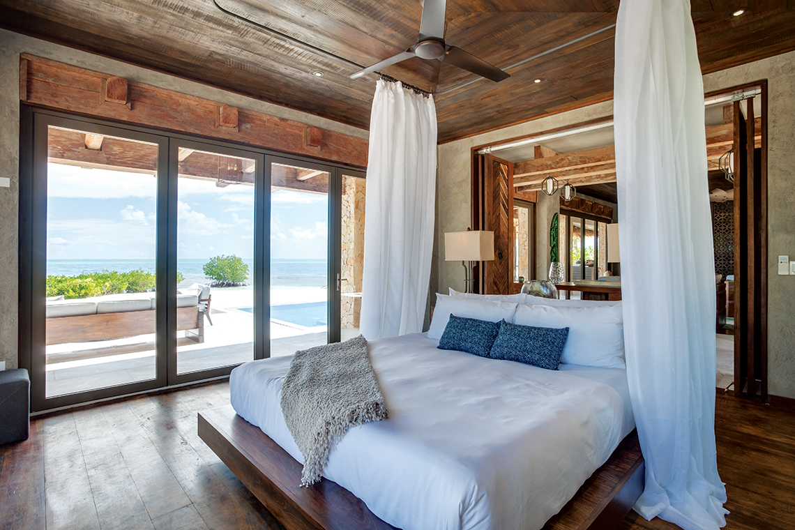 The aerial view over the island shows crystal clear water with 200-foot visibility and beautiful green reefs. Being close to the reefs provides a level of protection against rising tides, however David Keener explains, “In a storm we want the most protection possible, so I had from Florida, high-velocity hurricane shutters custom made.” The shutters are hidden and can be easily released if needed during an emergency.
