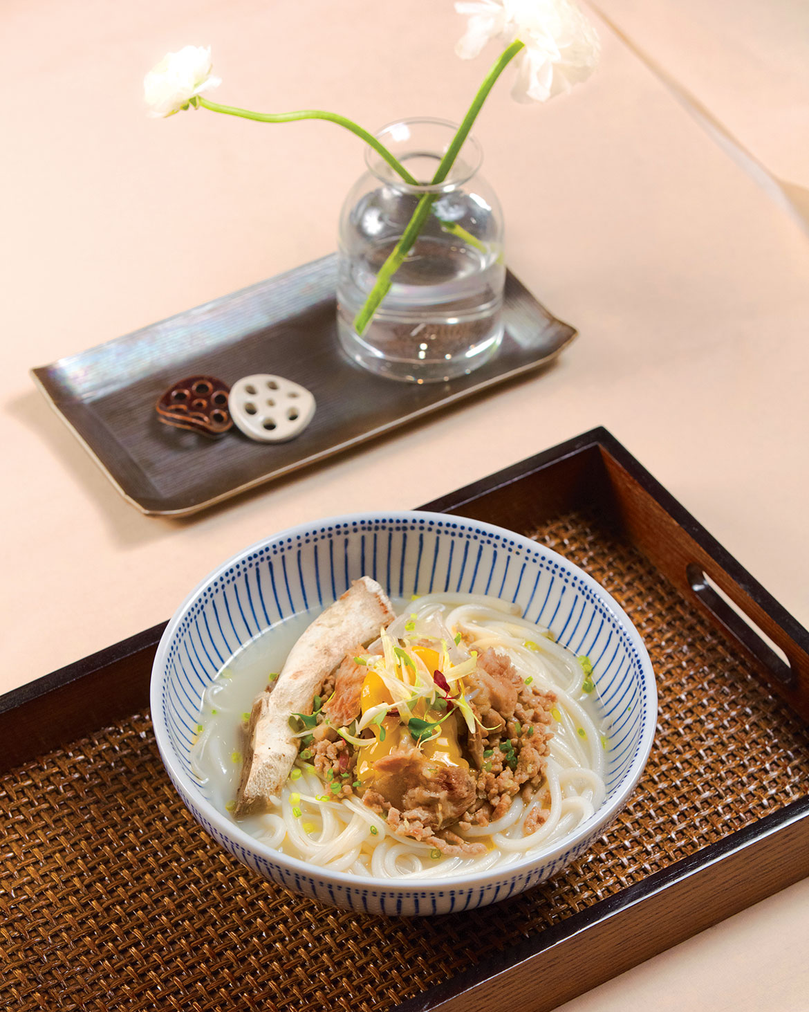 Some classic dishes from Chef Wang’s hometown, such as the Fish Fillet Mifen, have found their way onto the menu. Served in a traditional clay pot, the soup is offered with a side of noodles. For this dish, the pork bone broth is simmered overnight then boiled on low heat until the lucid base turns milky white. It is then topped with wok-fried fish and pickled vegetables to bring out its unique flavor.