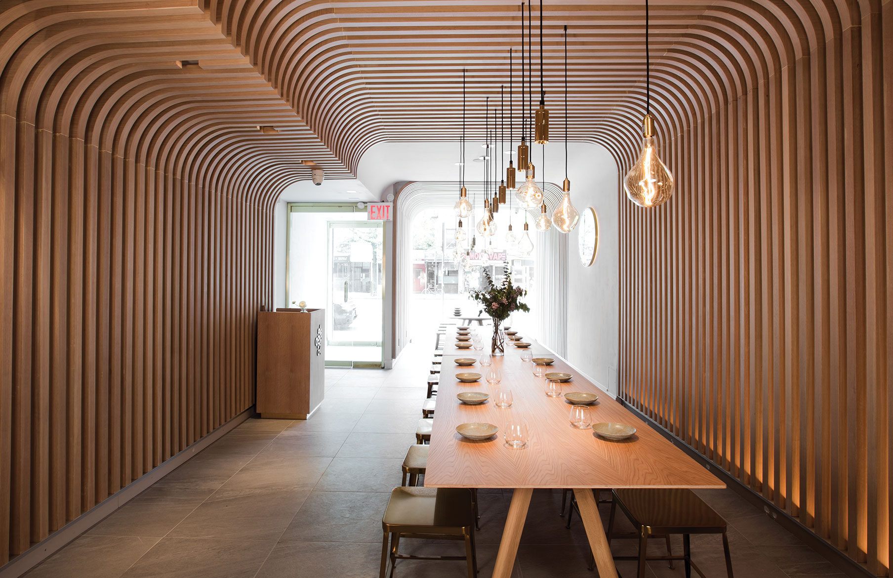 Inside, the wood-lined archways mimic the shape and color of rice noodles. This woodwork frame serves as a sort of geometric screen, and is illuminated by warm undertones from backlighting and lighting fixtures. These fixtures, including large exposed bulbs, provide both an intimate and social dining setting for the restaurant’s single and communal tables. And while being seated at the front of Hunan Slurp ensures a connection to the lively East Village vibe, diners seated in the space’s back have a view into the kitchen. The restaurant fills just 3,000 square feet in total, but overall, it is a true image of hungry New York.