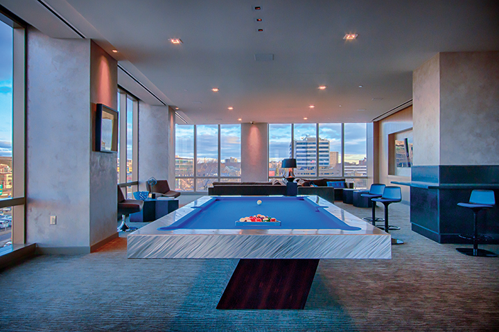 So why the sudden attraction to Fort Lee? Goldman explained, “We’ve had great success in attracting people from Manhattan (roughly 25 percent of the tower’s residents) whose rents have skyrocketed. The rent is halved with far more features, finishes, and amenities than are found in Manhattan.” From the floor-to-ceiling windows to the 1.6-acre park found nestled between the towers, every component of The Modern was thoroughly thought through by all those involved. “People want something new, refreshing, modern—just different from what they’ve lived in before. One element that certainly has a great effect are the views. Whether you’re on the 7th or 47th floor, the views are simply spectacular.” After conducting multiple view studies and finding that they’d achieved perfect 360 degree views, it became abundantly clear that Elkus Manfredi’s design was simply spot on.