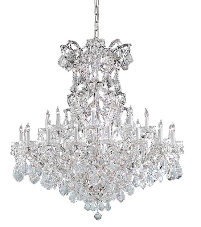 Crystal Chandeliers exude high-class and glamour. Perhaps one of the most popular is luxury lighting brand Crystorama. Shown here the Maria Theresa model, showcases 25 candelabra lights of Swarovski Strass Crystal on a polished chrome luxury Chandelier. Weighing 140 lbs, this 1,000 watt glass fixture hangs 46 by 48 inches. Crystorama can be found at Wyckoff Lighting.