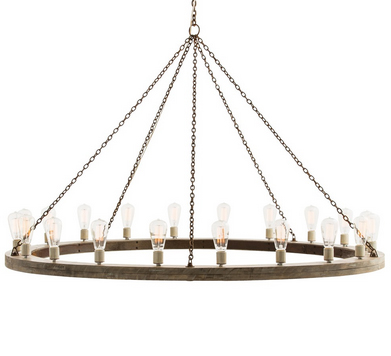 Collection at a height of 40.5inches and 60 inches in diameter. Hanging by a purposely rusted chain, the large, gray wood ring makes an impressive statement when hanging from a beam in a Great Room or hung above a large round dining table. The Edison bulbs in the photo reinforce the rustic, industrial feel. This chandelier can even be a focal point in your outdoor covered areas. The Anteriors brand can be found at Jewel lighting in Jersey City.