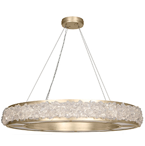 Using thousands of handmade “rough cut” crystal gems made in Fine Art Lamps glasswork, the slight imperfections in cut make it one of a kind versus mass produced. Available in champagne tinted pale gold leaf or silver leaf, the chandelier weighs 90 lbs and holds a 40 watt bulb. Capitol in Paramus NJ, carries this very upscale brand Fine Art Lamps.