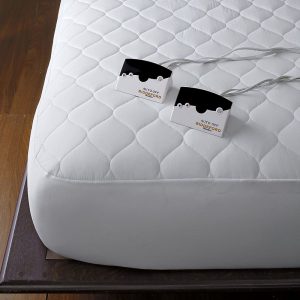 The Quilted heated mattress pad is made from a cotton blend with synthetic fill. It features 10 adjustable warning settings, a lighted digital control and 10-hour auto-off switch.