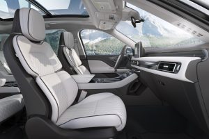 This seven-passenger crossover has a sleek silhouette by toning back on the typical “boxiness” of Lincoln vehicles. The vehicle features three eye catching grills, nostalgic Lincoln symbols and aspects, along with 21” wheels. The inside of the vehicle has a sanctuary-like aura with outdoor noise cancellation, a Revel Ultima 3D sound system, ambient lighting, a 10-inch touchscreen and a leather wrapped steering wheel equipped with audio and cruise control. For extra comfort, the front seats feature a 30-way adjustable seat, heat and massage chairs.