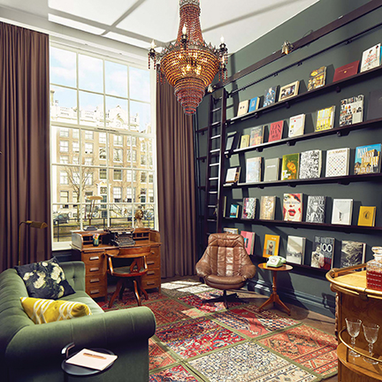 hp-5Each unique suite has something different to offer. The Art Collector’s Suite for instance, was inspired by the enormous collection of art gathered through the years by Pulitzer, while The Book Collector’s Suite is based on Amsterdam houses with beautiful book collections and is meant to feel like the home of a romantic book collector, explorer or intellectual. The centerpiece of the room is a dramatic, floor-to-ceiling book display with old and current books from stores found on The Nine Streets.