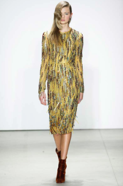 Stylist turned designer, Rachel Zoe put out her strongest collection, composed of beaded, flapper inspired dresses. While contrasting masculine and feminine (hard versus soft), Zoe used silk, fringe, and pearls to add shine to her garments, leaving us with old Hollywood glamour vibes. At the Zimmermann show, shiny fabrics with sparkling details were front and center. Reflective accents on flowing sleeves and pants provided an effortlessness while still remaining rich and luxurious. Most known for her bridal collections, Jenny Packham also used 70s-80s disco as inspiration for her ready-to-wear collection. Incorporating elements like long billowy sleeves, with sparkly details such as sequins and glitter tulle, her dresses are the true essence of glamour and sophistication.
