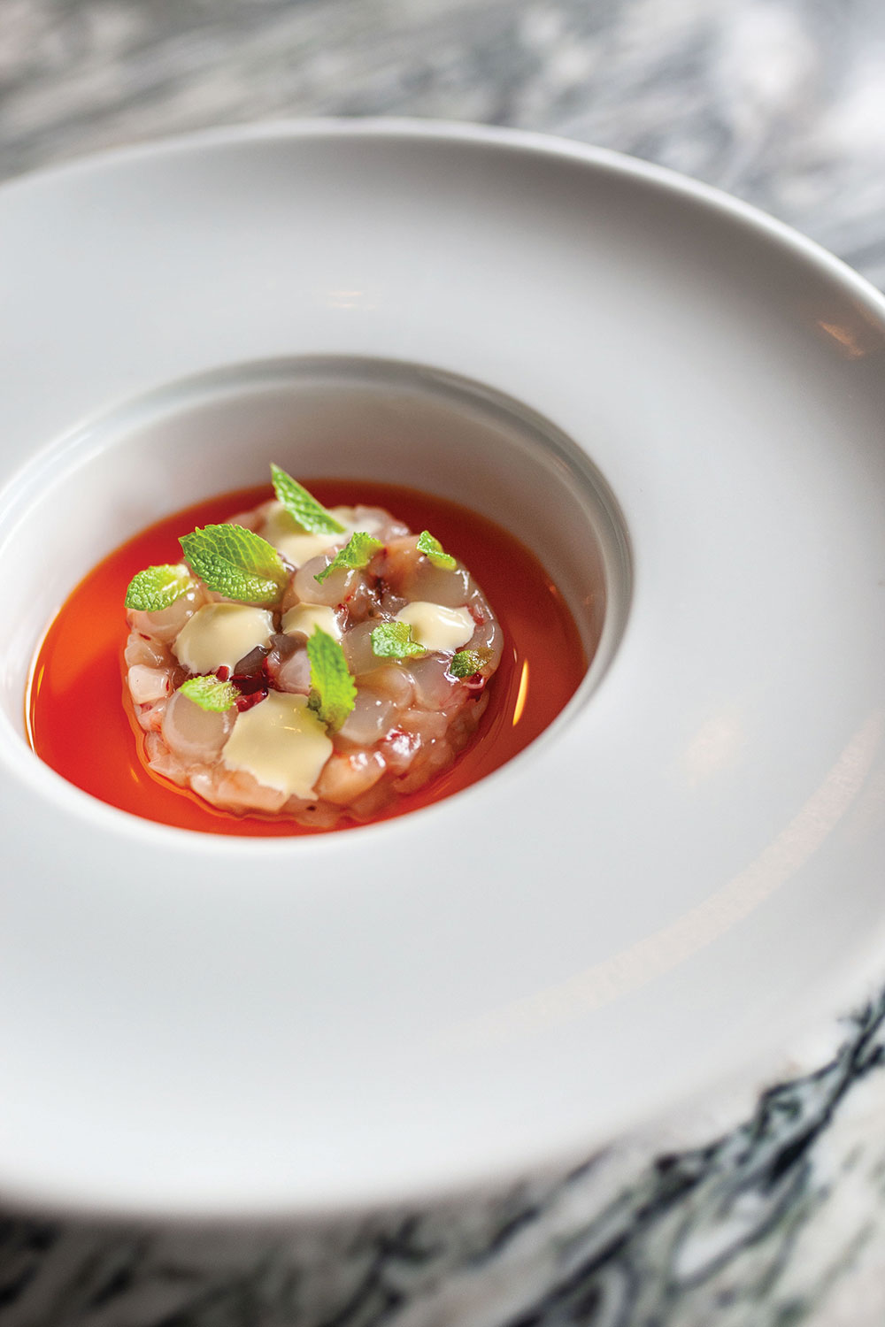 “When I created the dish, I thought, ‘How many people in New Jersey are going to pick up this shrimp and suck the brains out?’ So I ate at a few Michelin-starred restaurants in Europe and I remember this one served it as a crudo. It was one of the best things I’ve ever eaten. That dish inspired me to serve it as a crudo here, with shrimp head oil that’s almost as red as the shrimp themselves. You get that super intense flavor from the head and the raw part of the tail is marinated in lemongrass, ginger, gin and mint. A lot of Michelin-starred restaurants in Italy almost do Italian food without boundaries. I wanted to take things like lemongrass that you wouldn’t think about in Italian food, and give the dish a higher level of flavor that you normally don’t get in New Jersey. The gin for instance, acts like a drying agent when you’re eating this raw shrimp. Then you have lemon gel and roasted garlic crema over the top with fresh mint, which is the kicker to freshen up the dish. It’s a more foodie dish for sure,” Felice explained.