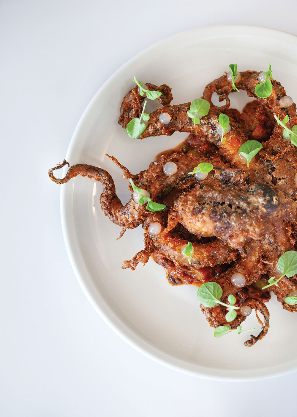 “I hit the books and started to figure out how I wanted to go about doing it. I love throwing in little twists. We fry the whole octopus and add a sort of Asian influence with the tempura. The octopus gets braised from four to six hours to make it insanely tender. Staying true to the super simple Italian style, we’re taking this beautiful product and doing something crazy/cool with it: putting it on the plate so it almost looks like it’s swimming.”