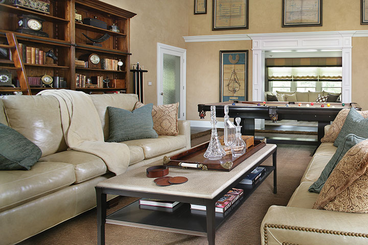 The home itself is also a house built on moods. The uniqueness and versatility of each room is an example of that, like the great room, which features a pool table and a dark wood library. The light tan walls and furniture are broken up with blue accents, including the large prints on the walls, which Polo explained are blueprints of iron work from the 1930s, which came in the perfect colors to tie into the home. Another standout feature is the fireplace, originally from the late 1980s/1990s. What initially was a floor-to-ceiling fireplace was cut and made into a mantel, then the real, original stones were made into a different color to work with the room.
