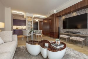 Using wool and silk rugs, contemporary sofas, a stunning Wendell Castle walnut-topped coffee table and a pop of Mademoiselle tile to produce a stand-out element, an invitingly beautiful living area was formed. The Kravet Couture window treatments provide a dash of shimmer and compliments the color palette of the apartment. Walking into the bedroom, you are welcomed by clean, contemporary lines, suede accents and beige tones. A luxurious Poliform bed and warm wood KGBL side tables bring harmony to the space.
