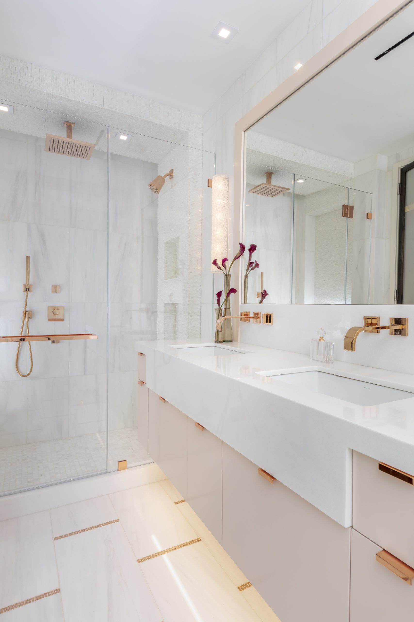 The final impressive room from this project is the master bathroom which has been described as a “jewel box”. The emphasis and arrangement of each material accentuates the sophisticated charm of this bathroom. Featuring Bianco Diamante floor tiles with rose gold mosaic inserts and cut mosaic tile throughout, the simplistic beauty of the space is highlighted. Glimmering sculptural sconces and a dash amethyst creates a refined and fresh aura. The choice of rose gold as an accent metal allowed for a lovely disbursement of rose gold bits throughout the apartment, creating a subtle elegance in the contemporary space.