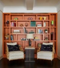 A stunning component of this apartment is the grand, burnt-orange custom bookcase. Organically-shaped, rattan Palecek chairs add an accentuating dimension beneath the bookcase. Moving into the dining room, modern Cliff Young chairs encompass a rich, dark wood table from Bright Group, which features pieces of glass inlaid in areas of the table. A stunning Ochre chandelier dangles over the table, providing a divine focal point for the room.