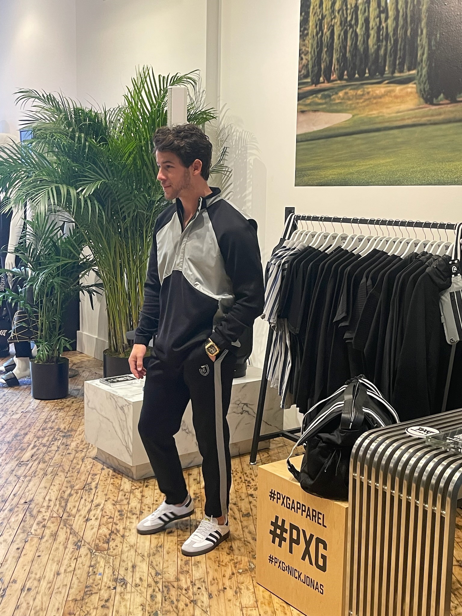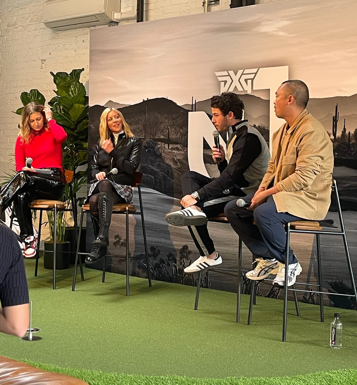 The PXG x NJ Capsule Collection debuted on November 15 at a pop-up experience in NYC’s Soho neighborhood. In celebration of their collaboration, Nick Jonas and Renee Parsons, Executive Creative Director of PXG Apparel and wife of PXG founder, Bob Parsons, hosted an immersive experience and panel discussion, moderated by HYPEGOLF. Designed after the PXG House at the internationally acclaimed Scottsdale National Golf Club, attendees of the PXG Clubhouse were able to play a round on the putting green, enjoy a gifting clubhouse locker room, and try on and shop the limited-edition collection that includes vests, joggers, jackets, tees, cross over bags, sandals, and much more.