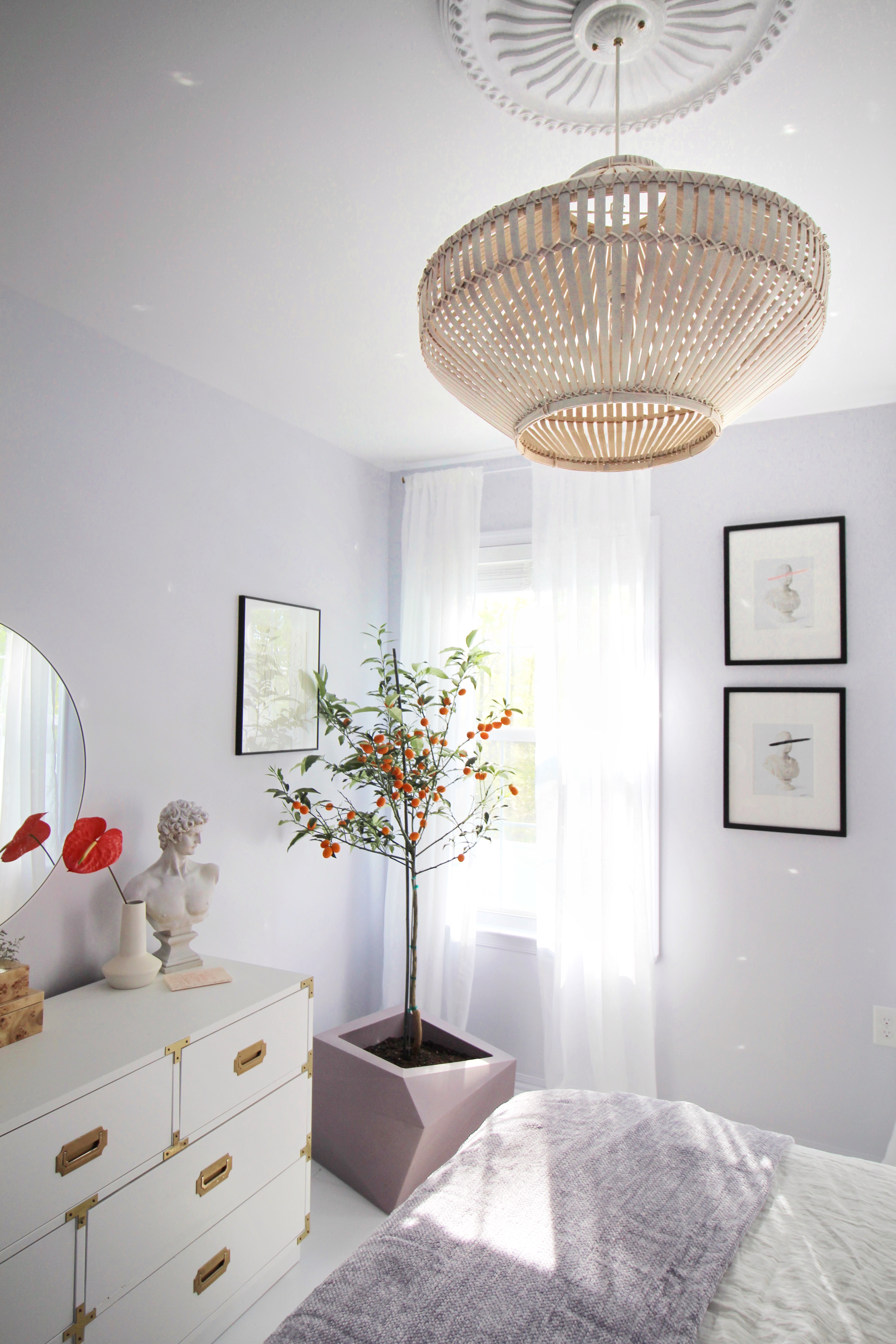 For her newly-designed guest room, Irwin wanted to replace the previous ceiling but ran into a few unexpected challenges along the way. She explained, “We recently removed the popcorn ceiling out of our guest room and let me tell you it’s not like the DIY videos you see on HGTV. We had to completely redo the ceiling with new sheetrock.”