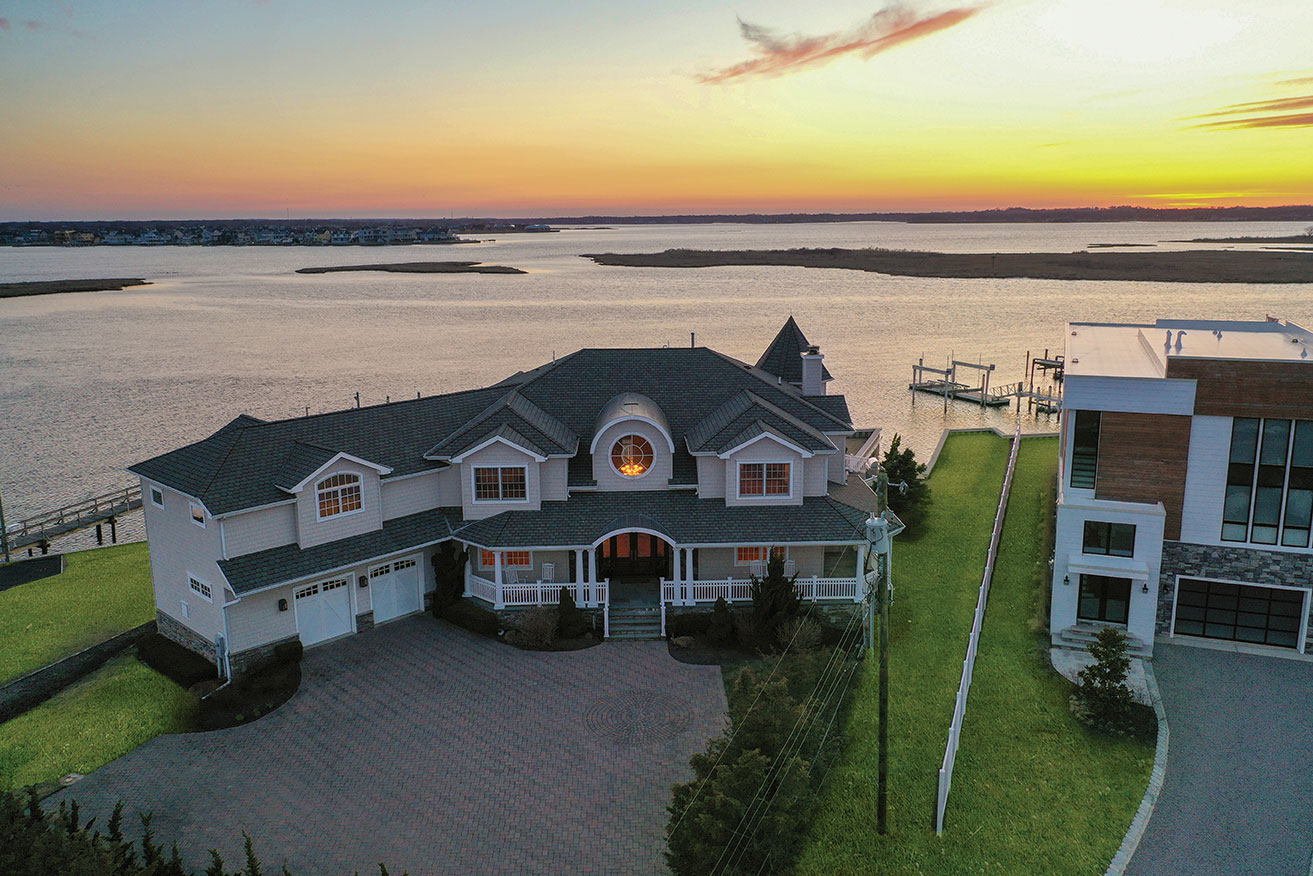 —Along the water’s edge in Monmouth Beach, NJ, a stately custom colonial home offers unobstructed sunset views and luxury beach living at its finest.
