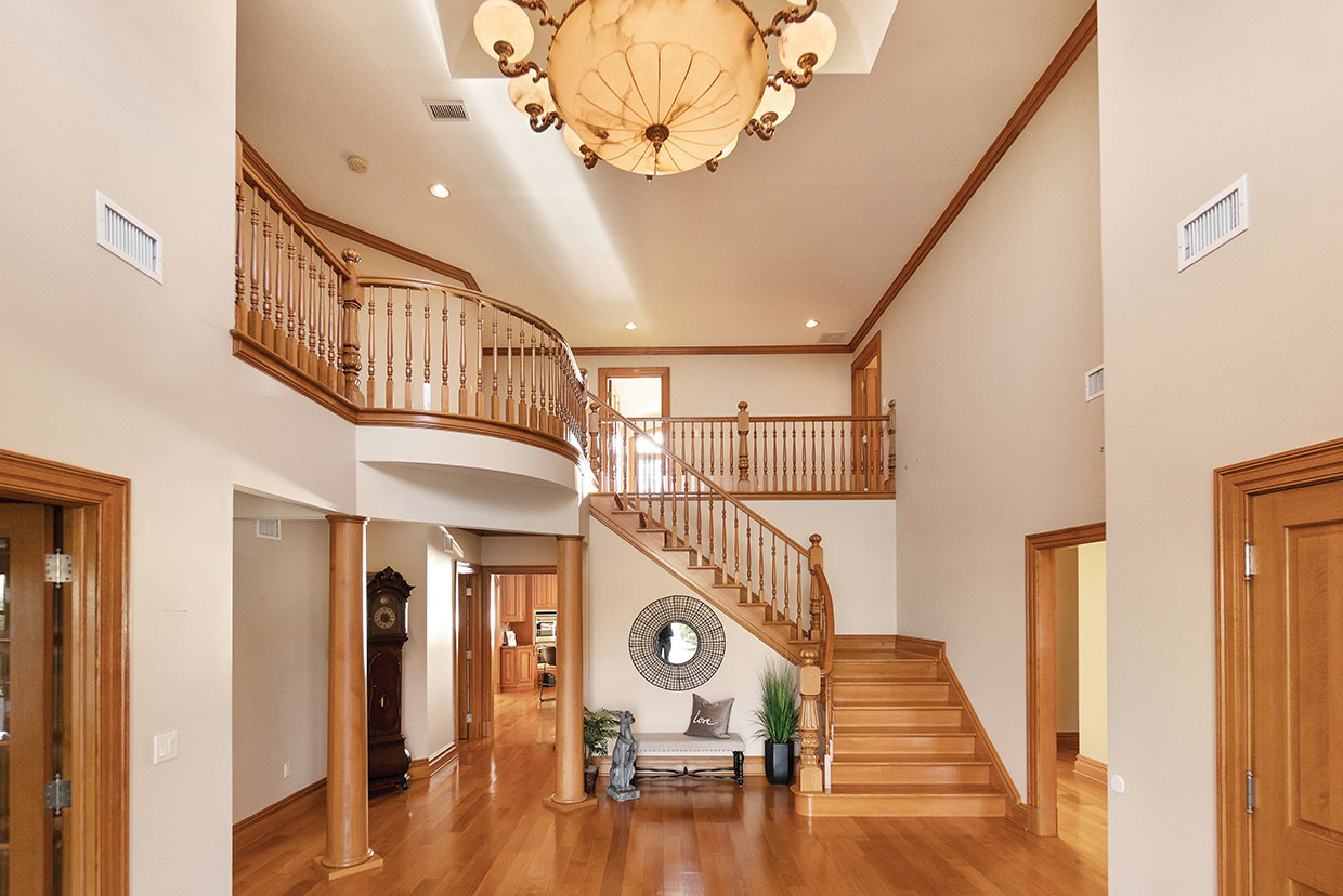 The first stop upon entering this remarkable space is the grand foyer. Glass-paneled double mahogany doors welcome guests into the light and bright entry room of the house. Breathtaking and beautiful from the first glance, the foyer showcases intricate columns, pristine hardwood floors, and a winding staircase leading to the second level. To the left of the foyer, behind the glass-paneled doors, is an oversized living room perfect for entertaining and making an impression on guests from the moment they walk in. To the right of the foyer is an additional room that can be used as another sitting room or as recreation or office space. The beautiful entryway and front sitting rooms are only the very beginning of what this unique home has to offer prospective buyers.