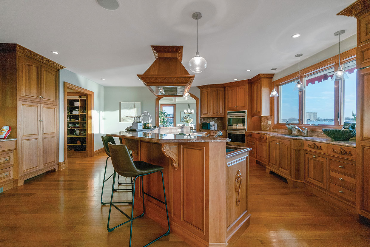 The heart of every home is the kitchen, and 12 Sunset Lane’s is no exception. In this updated, expansive kitchen, family and friends can cook, eat, and socialize with panoramic water views in the background. A cook’s dream come true, this gourmet kitchen is equipped with premier appliances, ample preparation surfaces, and a custom multi-level island with space to dine and to cook. Most impressive of all is the kitchen’s walk-in butler’s pantry. Complete with custom shelving and storage solutions and partitioned by a glass-paneled door, this oversized pantry is the finishing touch on the perfect kitchen.