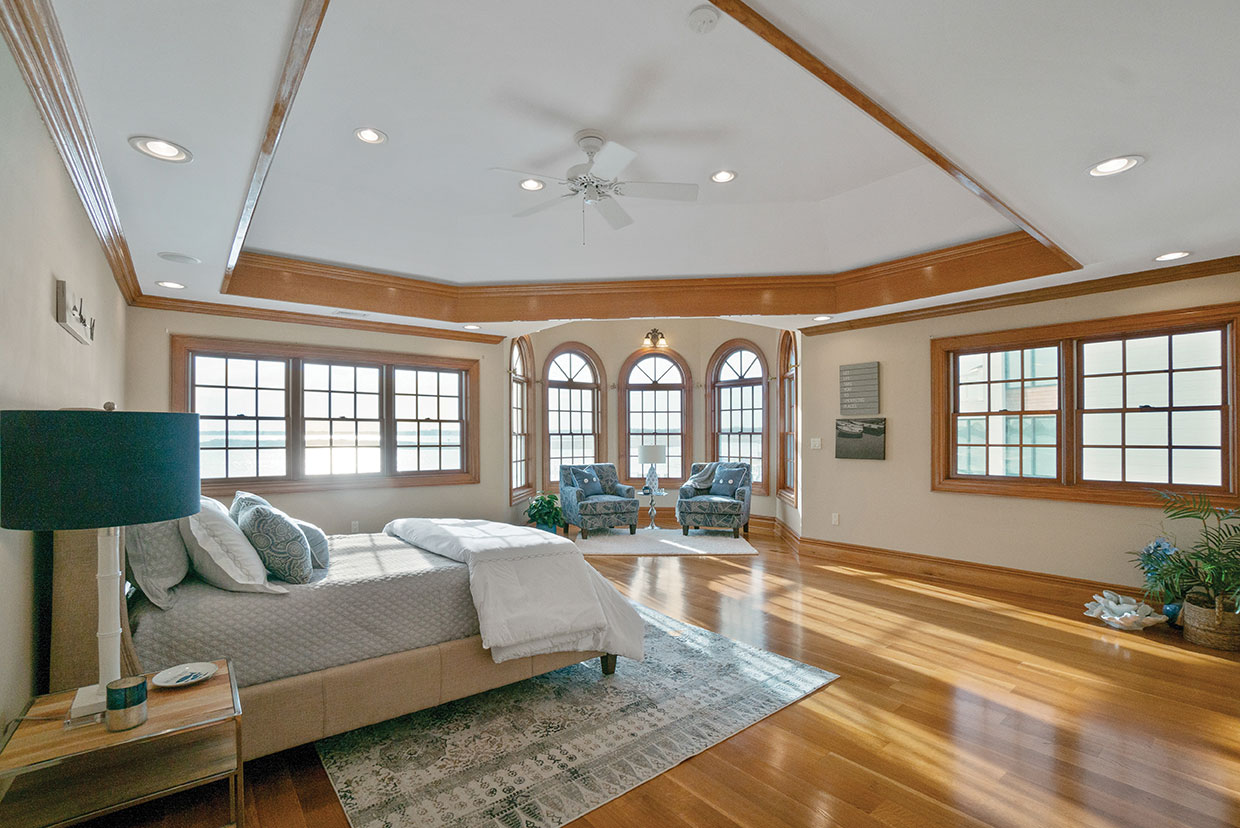 If we backtrack to the foyer and head up the winding staircase, the second level of 12 Sunset Lane offers more comfortable living spaces, additional waterfront views, and several private bedrooms. While almost every room on the home’s upper level provides wide-angle views of the sea, the master bedroom is the most impressive, and rightfully so. Upon entering the master suite we can envision ourselves stepping out of the shower for a quick glimpse of the shore sunset before heading out for an evening on the town. Possibly the most beautiful room in the house, 12 Sunset Lane’s master suite is open and bright with water views at every turn. The immense master bath with double vanity, walk-in shower, and separate soaking tub and the custom, oversized walk-in closet make this master suite one of the best in Monmouth Beach.